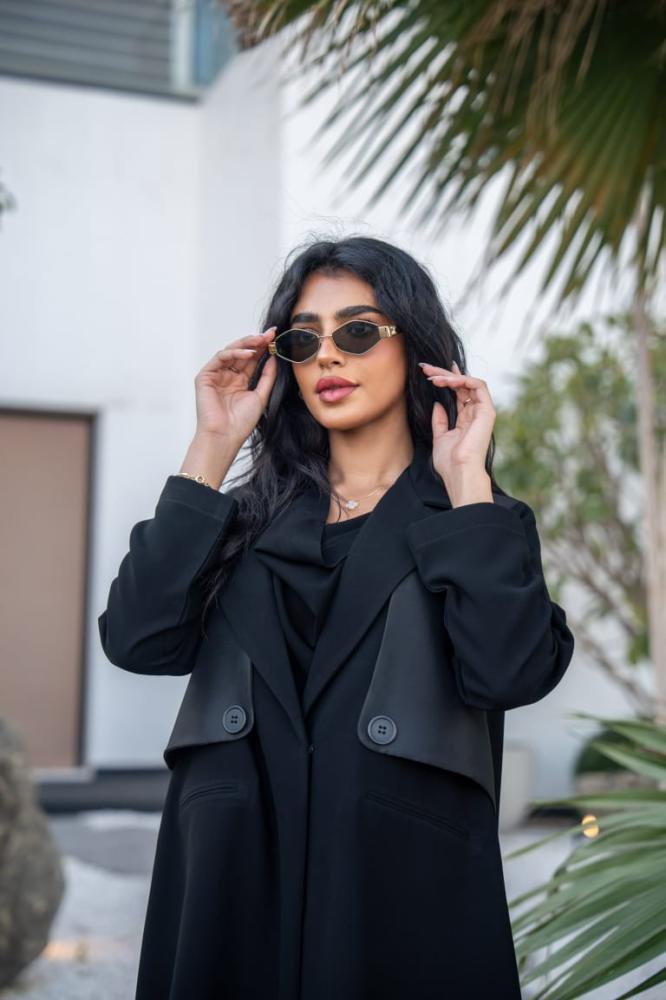 عباية بليزر بلون أسود مصنوعة من قماش الكريب,. بتصميم مميز في الأطراف بخطوط هندسية بدرجات مختلفة من الأسود. فيها ياقة لابيل وأكمام طويلة وقصضة
