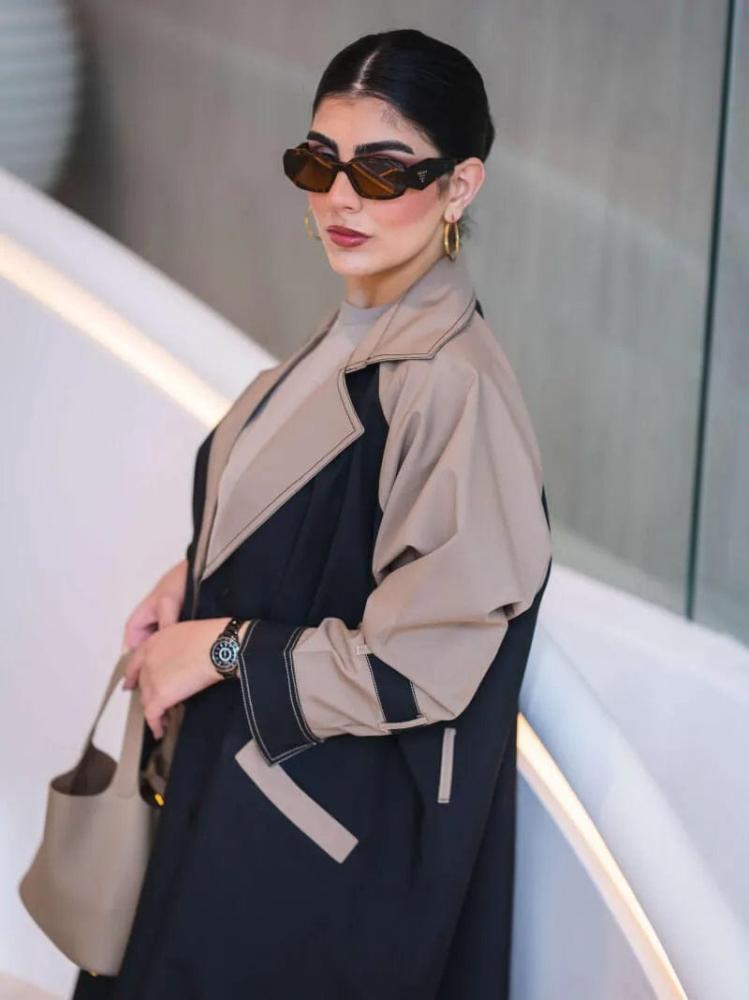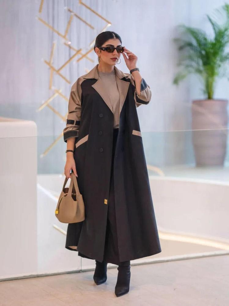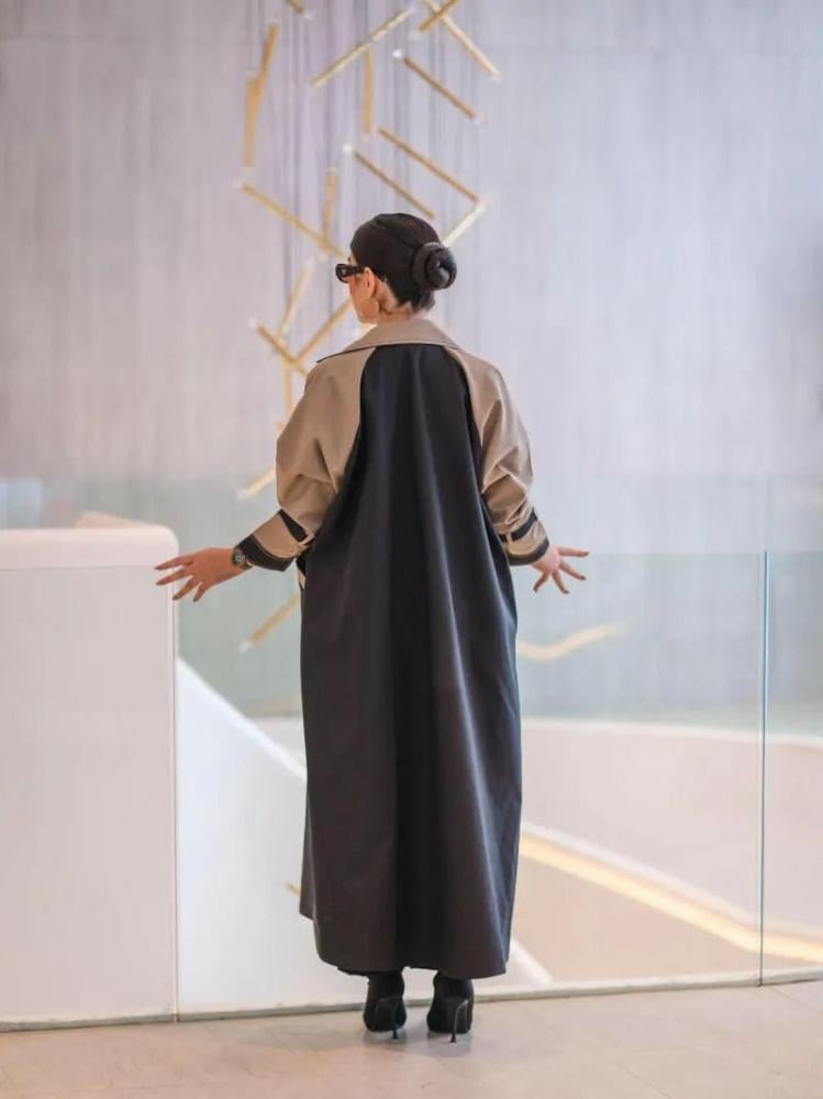 عباية بليزر طويلة بتصميم مميز بلونين: أسود مطفي مع بيج زيتي ناعم. قصة رسمية ومرتبة؛ فيها ياقة كلاسيكية وأزرار أمامية مزدوجة تعطي ستايل جريء وراقي. اللمسات على الكم والتطريز الخفيف تعطي العباية لمسة
